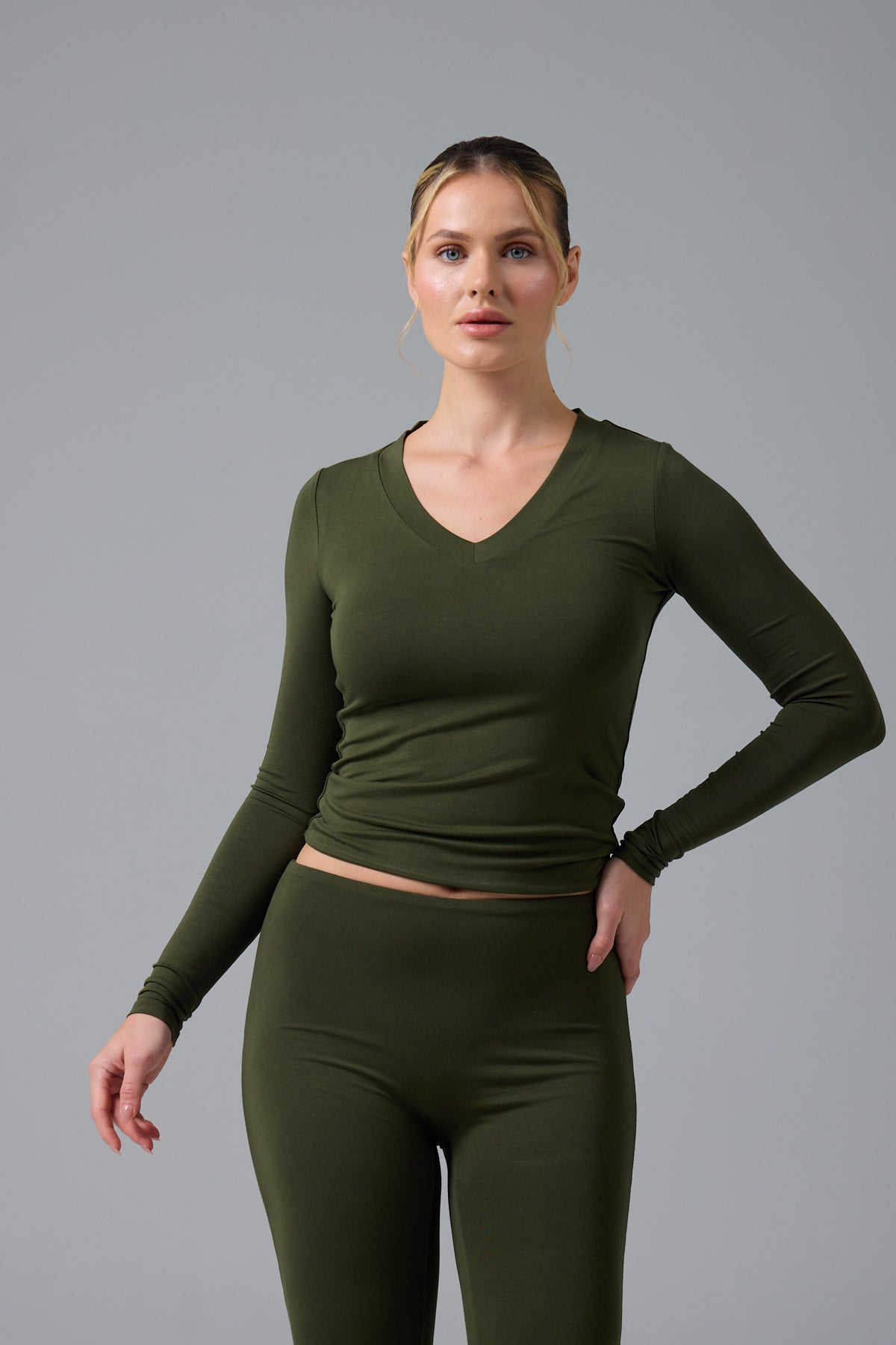 Normal Fiyat 1,589.00TLİmza Kumaşımızdan üretilen V Şeklinde Uzun Kollu Tişört, tüm göğüs ölçülerine uyum sağlamak ve onları desteklemek için V şeklindeki yaka boyunca bir inçlik bir bantla donatılmıştır .